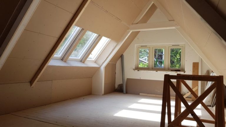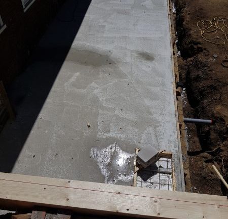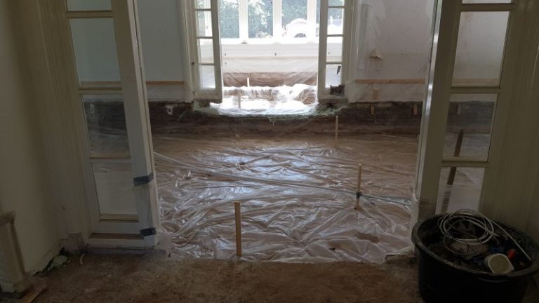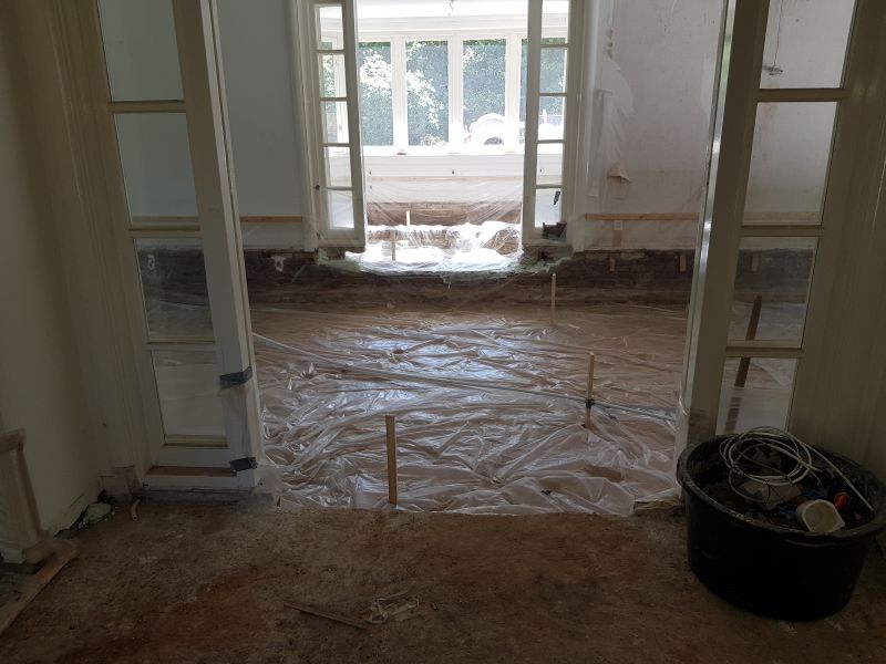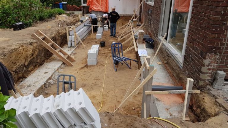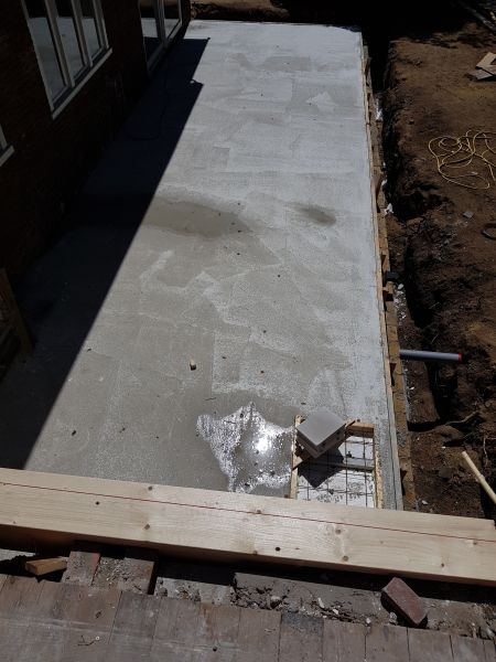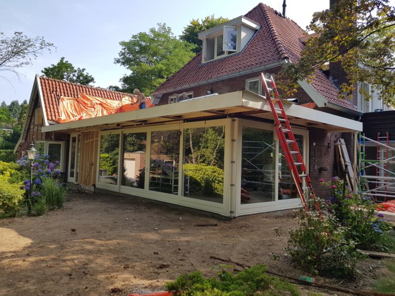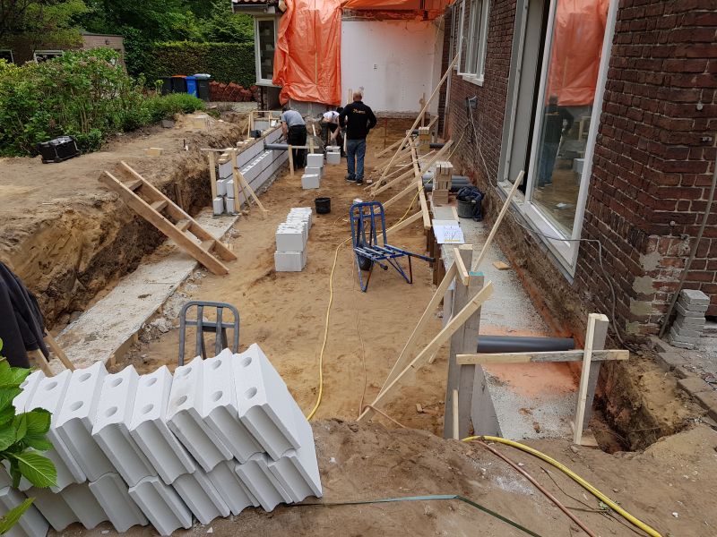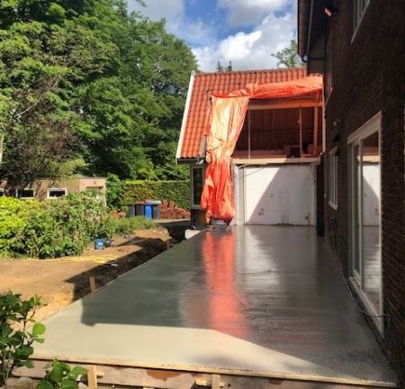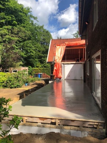 Het sloopwerk is inmiddels gereed en de aannemer is begonnen met zijn werkzaamheden. Binnen enkele maanden moet het werk gereed zijn en dus wordt er door aannemer “gestreden op 3 fronten” De zolderverbouwing vorderde gestaag, de begane grondvloer van de grote uitbouw ligt er in en er is gestart met het uit timmeren van de kap van het bijgebouw. Half juni zijn de schuimbetonvloeren van 50 cm dik op de begane grond gestort. Deze vloeren hebben een hoge isolatiewaarde met een Rc van ± 5 m2 K/W.