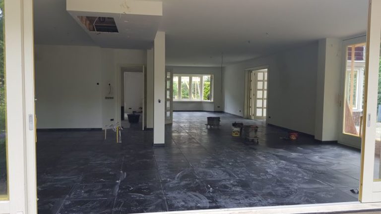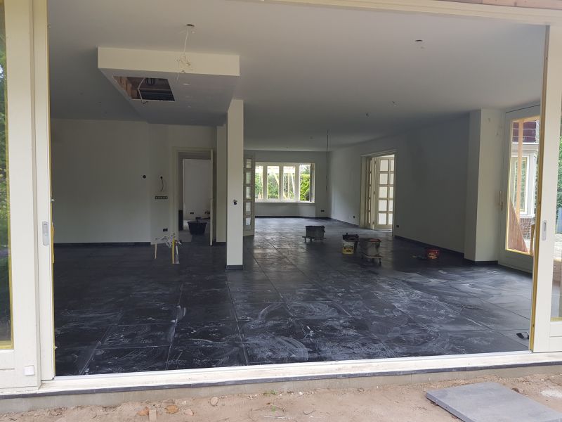 Inmiddels nadert de verbouwing zijn eindfase. De uitbouw van 4 x 13 meter is gereed en de natuurstenen vloer is gelegd. Ook de architectonische aanpassingen van het bijgebouw vorderen gestaag. De Gevels van het bijgebouw worden bekleed met Western Red Cedar rabatdelen. Op de verdieping van het bijgebouw is een mooie ruime slaapkamer gecreëerd welke vanuit het woonhuis is te bereiken via een corridor.