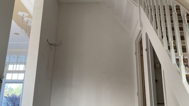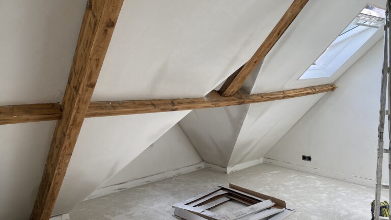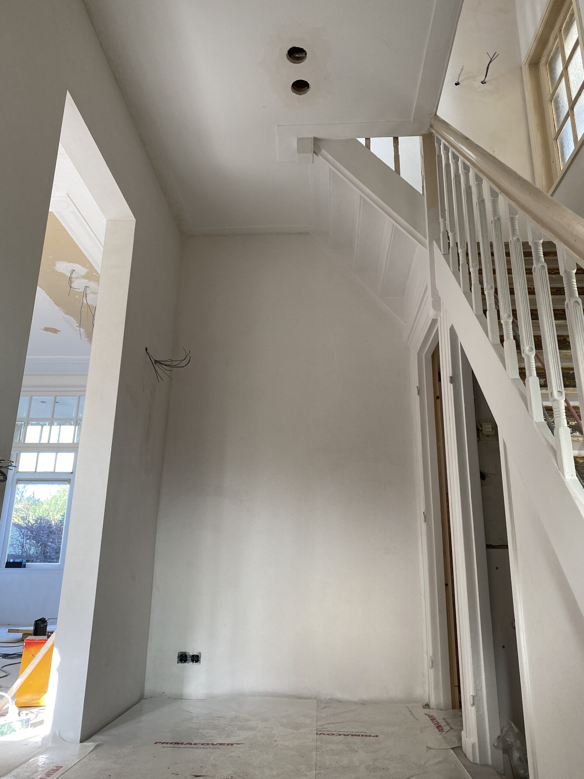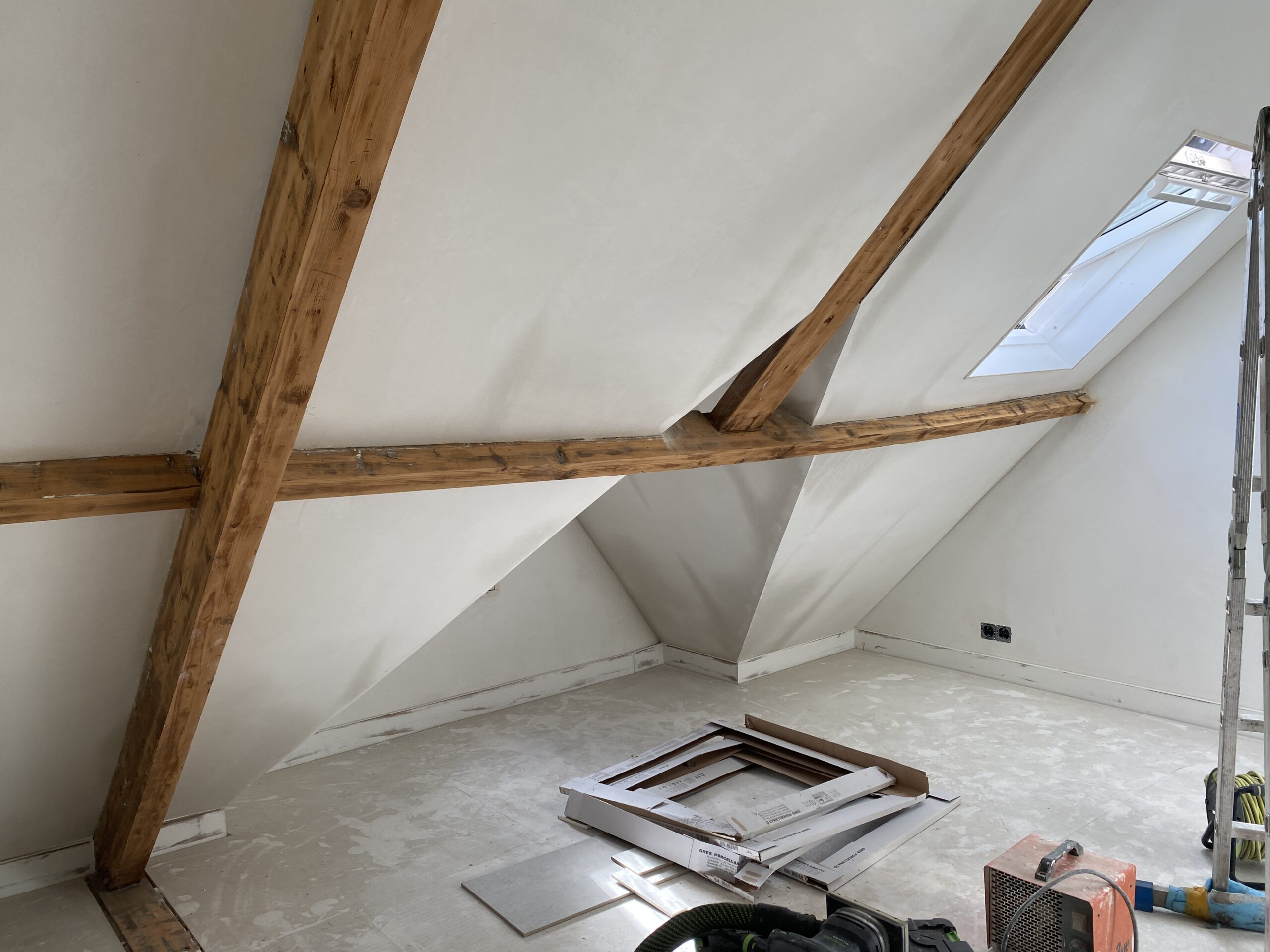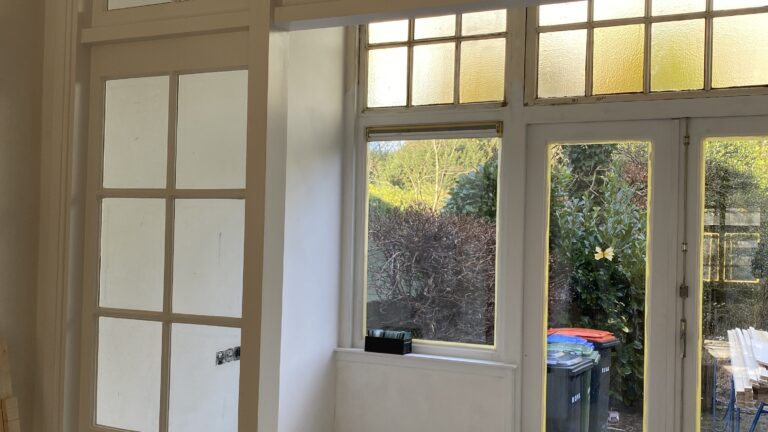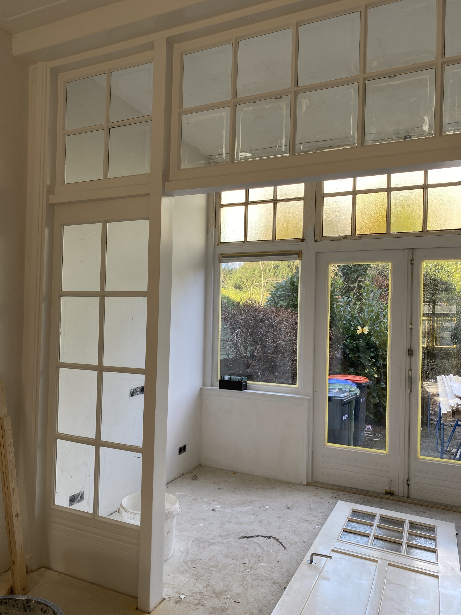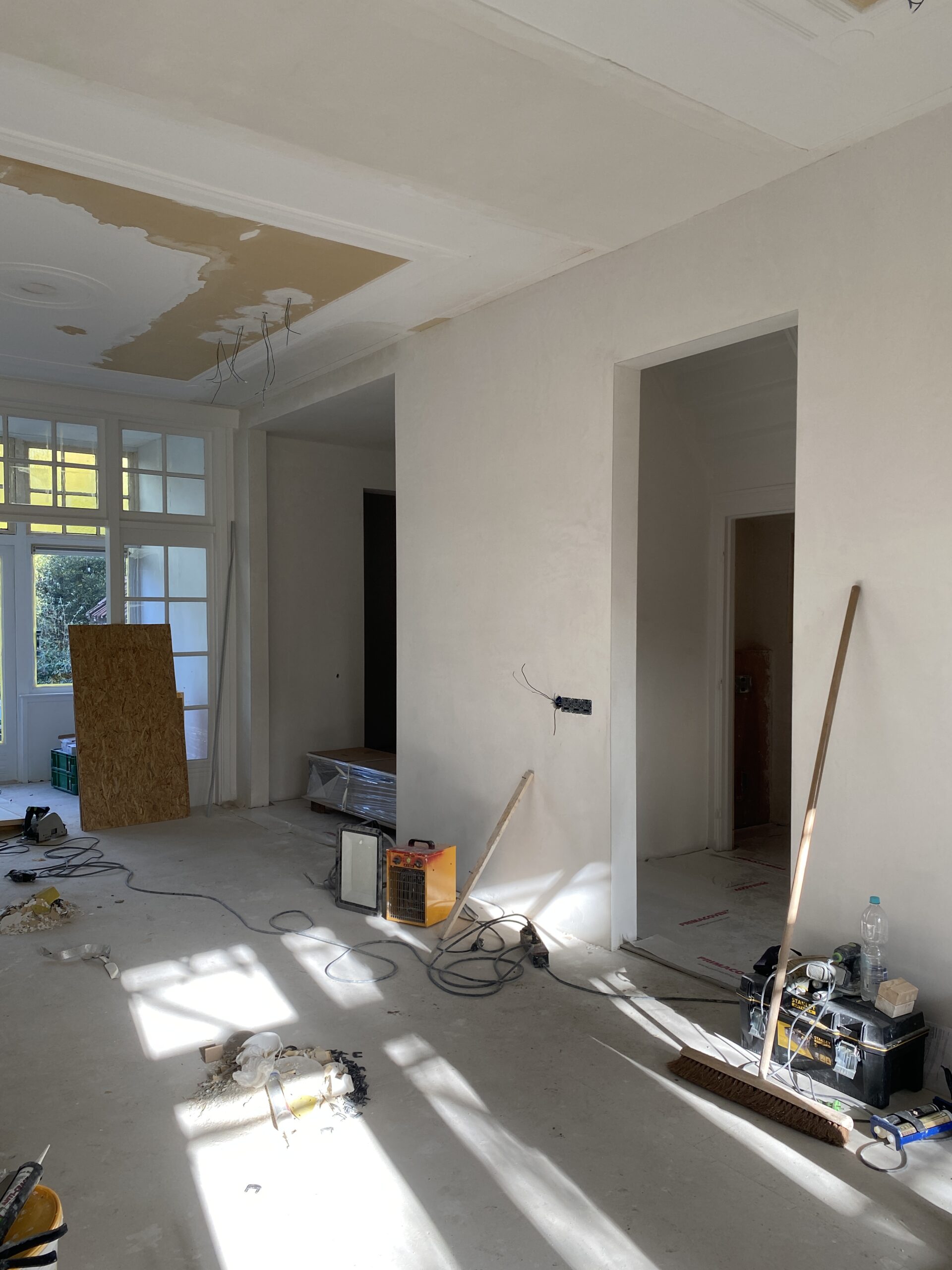 In deze prachtig vormgegeven en gedateerde woning is de afronding, ofwel afbouwfase, in volle gang. Tegelwerk sanitaire ruimten en keuken worden afgerond. Plafond afwerking vordert gestaag met inbegrip de afwerking rondom de stijlvol afgewerkte inbouwspots. De schilders zijn zowel binnen als buiten de woning aan het voorzien van de nieuwe verflagen. Tenslotte is de elektricien bezig met de aansluitingen en het inregelen van alle elektronische schakelingen. Kortom. Een oude woning die volledig in een nieuw jasje wordt gestoken.
